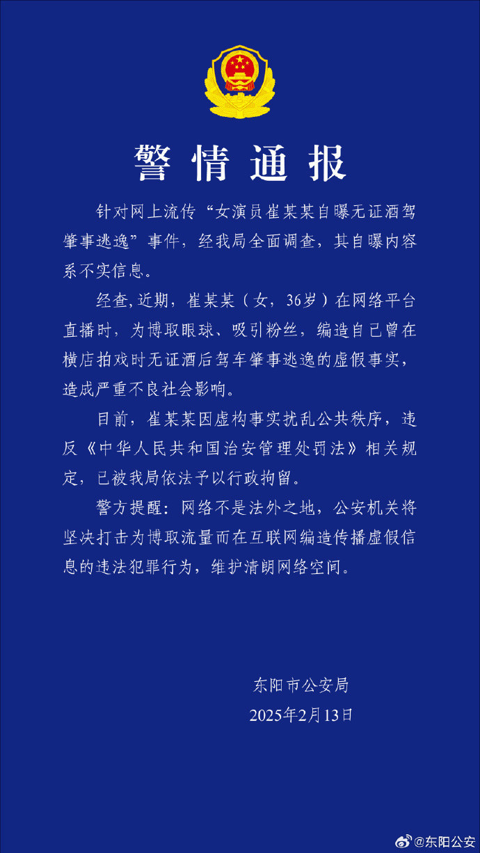 1905电影网讯 2月13日,浙江省东阳市公安局官博东阳公安,发布警情通报称:“女演员崔某某自曝无证酒驾肇事逃逸”事件:“经我局全面调查,其自曝内容系不实信息。为博取眼球、吸引粉丝,编造自己曾在横店拍戏时无证酒后驾车肇事逃逸的虚假事实,造成严重不良社会影响,已被我局依法予以行政拘留。”