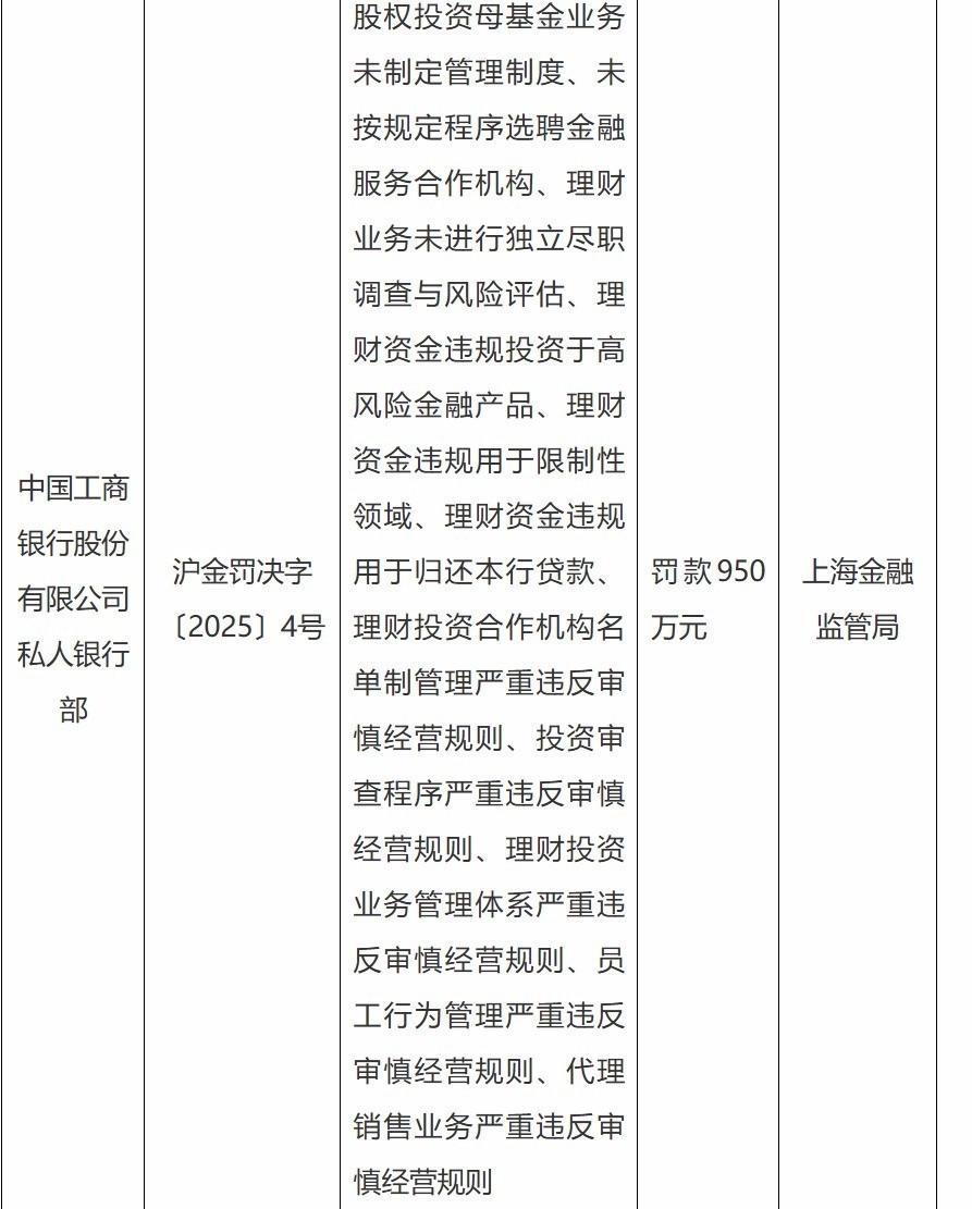 1月15日,国家金融监督管理总局官网披露工商银行私人银行部因涉及多项违法违规行为,被上海金融监管局处罚950万元。具体违法违规行为包括:股权投资母基金业务未制定管理制度、未按规定程序选聘金融服务合作机构、理财业务未进行独立尽职调查与风险评估、理财资金违规投资于高风险金融产品、理财资金违规用于限制性领域、理财资金违规用于归还本行贷款、理财投资合作机构名单制管理严重违反审慎经营规则、投资审查程序严重违反审慎经营规则、理财投资业务管理体系严重违反审慎经营规则、员工行为管理严重违反审慎经营规则、代理销售业务严重违反审慎经营规则。